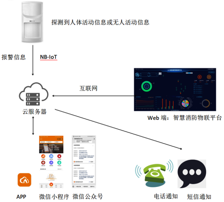 l NB-IoT通信 ,云平臺(tái)、APP、微信公眾號(hào)、微信小程序、電話、短信等多平臺(tái)報(bào)警通知